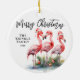 The same design appears on both sides of the ornament. All text, fonts, and colours can be customised to match your holiday style. A fun addition to any Christmas tree—especially for those who love flamingos, sunshine, and coastal charm.