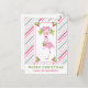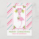A whimsical and tropical christmas postcard. A pink and green candy cane striped background. Layered over top is a fancy pink flamingo with a leg raised up. Wearing a pink santa hat and some seasonal holly. Holly with berries also decorate the corners. A floral bouquet above her head with candy canes crossed together.