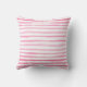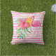 A bright pink flamingo and a tropical hibiscus flower arrangement are set against a fun background of watercolor pink and white stripes. The back of the throw pillow features the colourful pink stripes, without the tropical elements. If you prefer to use your pillow indoors, you can choose polyester or cotton fabric instead of outdoor fabric at checkout. A matching beach bag tote is also available.