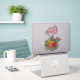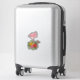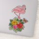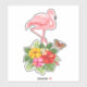 Contour sticker with a cute digital illustration featuring a pink flamingo with one leg raised. Standing on a bouquet of tropical hibiscus flowers and leaves. A pretty butterfly is hovering around the flowers.