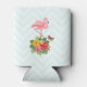 Can cooler with a cute digital illustration featuring a pink flamingo with one leg raised. Standing on a bouquet of tropical hibiscus flowers and leaves. A pretty butterfly is hovering around the flowers. A light green and white chevron pattern in the background.