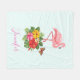 A blanket with a cute digital illustration featuring a pink flamingo with one leg raised. Standing on a bouquet of tropical hibiscus flowers and leaves. A pretty butterfly is hovering around the flowers. A light green and white chevron pattern in the background.