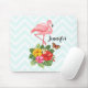 A mousepad with a cute digital illustration featuring a pink flamingo with one leg raised. Standing on a bouquet of tropical hibiscus flowers and leaves. A pretty butterfly is hovering around the flowers. A light green and white chevron pattern in the background.