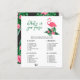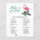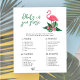 Baby shower invitation design features pink flamingo with lush green palm leaf fronds and tropical hibiscus flowers. "Aloha Baby". A tropical floral pattern with black background colour dresses up the back of the card.