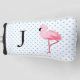 Cute lady's golf club cover done in a sky blue on white polka dot pattern. Fun graphics of a pink fuzzy flamingo, decorates the cover. Personalise the black one letter monogram to read what you want. Great gift idea. Matching driver cover is available.