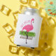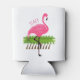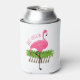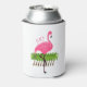 Keep your canned beverages cool with this fun can cooler. The front and back design has a pink flamingo, on one leg, standing in front of a row of palm trees.