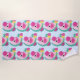 A beach towel with a pattern composed of a cute illustration - pink flamingo with watermelons and pineapples. Pink and green colour scheme. Summery and tropical.