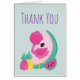 A thank you card with a cute illustration of a pink flamingo with some watermelons and pineapples. Pink and green colour scheme. Summery and tropical. A pale green background with white polka dots.