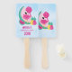 A personalised hand fan with a cute illustration of a pink flamingo with some watermelons and pineapples. Pink and green colour scheme. Summery and tropical. The background is a light blue watercolor image. Perfect for an outdoor birthday bash in the hot hot summer.