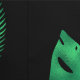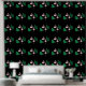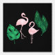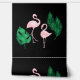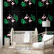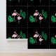 This custom wallpaper features a tropical pink flamingo design on a black background. An image of two pink flamingos and vibrant green palm leaves is tiled across the wallpaper. The image has a foil design that gives it a metallic appearance.