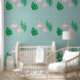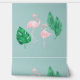 This custom wallpaper features a tropical pink flamingo design on a dusty teal coloured background. An image of two pink flamingos and vibrant green palm leaves is tiled across the wallpaper. The image has a foil design that gives it a metallic appearance.