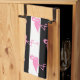 A pink flamingo pattern is on a black and white striped kitchen towel.