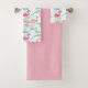 A pond theme towel set featuring a pattern of bright pink flamingos walking in a pond illustrated with accented with a solid warm pink bath towel.