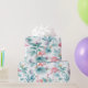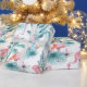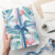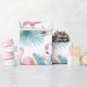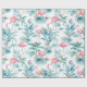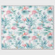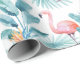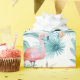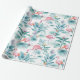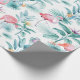 Tropical leaves and flowers with pink flamingos in a seamless pattern on a white background.