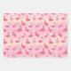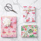Three sheet wrapping paper set with pink flamingos on a variety of backgrounds from pink and yellow watercolor to tropical leaves.
