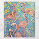 painting of cute pink flamingos on a purple background with blue and yellow leaves