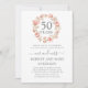 A pretty and elegant wreath of pink flowers surrounds 50 years to top off this 50th wedding anniversary party invitation. The text is a combination of modern calligraphy and classic upright text. The grey colour compliments the soft pink flowers