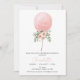 Sweet balloon first birthday invitation for a baby girl featuring a pink balloon and floral and foliage arrangement. This design also features a modern calligraphy font used for the age and name.