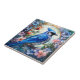 On this ceramic tile, a beautiful blue jay perches within a light sky circle. The circle and bird are surrounded and overlapped with pastel blue, pink, and orange flowers and buds. An overlay has been added to give a stained glass appearance. Pretty!