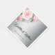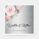 A gorgeous silver and pink personalised wedding napkin (or for any other event you may have in mind). The design features a silver background with a pretty pink rose bouquet at the top left.