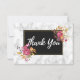 A wedding thank you card with a white marble background. Layered over top is a black frame with a thin gold coloured border. The corners are decorated with pink flower