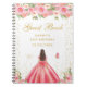 This elegant and glamourous birthday party guest book features a beautiful princess with brunette hair and fair skin in a pink ball gown. The text combines handwritten script and modern sans serif fonts for a classy and sophisticated look. The floral arrangements, butterflies and gold confetti create the perfect blend of rustic and chic.