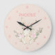 Sweet girl's bunny themed nursery clock featuring a white and pink floral arrangements. This wall clock is ideal for a girl's bunny or woodland theme nursery. Background color is changeable.