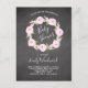 On this drive-by baby shower invitation, a pretty watercolor wreath of pink peonies encircles the words "Baby Shower" in elegant white handwriting script on a chalkboard background. The name of the mum-to-be appears in matching script, with the invitation details in white sans serif font.