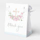 This design features a watercolor illustration of pink flowers, eucalyptus leaves, cross and angel. You can adjust text according to your requirements.. Texts "thank you" is written in a script font.