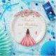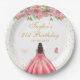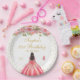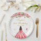 This elegant and glamourous birthday party plate features a beautiful princess with dark hair and dark skin in a pink ball gown. The text combines handwritten script and modern sans serif fonts for a classy and sophisticated look. The floral arrangements, butterflies and gold confetti create the perfect blend of rustic and chic.
