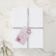 Very pretty pale pink tag with lace effect and arrangements of pink and plum flowers.