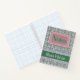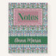 An intricate pattern of bright pink flowers with cheery green foliage and a striped blue piping. The bright green pronouncement, "Notes", is ornately framed with a pink lace border.