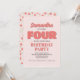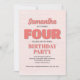 Make her day extra special with this girl’s fourth birthday party invitation! Featuring pink "four" typography, a cute floral pattern, and a simple template, this design is perfect for a modern, minimalist celebration. The whimsical calligraphy script adds a playful touch, while the elegant chic flowers bring a stylish whimsy vibe. Personalise this charming invite today for a fun and unforgettable birthday celebration!