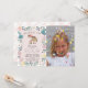 This cute "saddle up!" girl's birthday photo invitation card features a horse/pony with a pink ribbon/bow on a blush pink background surrounded by flowers and greeneries. The reverse side features a white background with handpainted check patterns in pink. Personalise it for your needs. You can find matching products at my store.