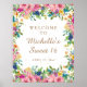 Elegant and colourful pink, blue, and yellow watercolor floral with gold glitter on a white Sweet 16 birthday party "Welcome" poster. Contact me for assistance with customisation or to request matching or coordinating products.