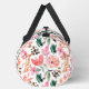 Stylish pink floral pattern features your monogram initials on the front of this large duffel bag. Measuring 23" x 12" x 12" (smaller size available), this bag is made with an all-over print on polyester poplin. Includes rugged 22" carry handles and a removable padded 27" to 48" shoulder strap with an interior zippered pocket. and mesh pocket on one end. MATCHING items in our collection.