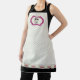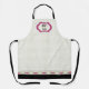Lovely hostess / chef apron done in a white, pink and green small floral pattern, with a large pink floral band, across the bottom. The bib has a pink framed text area, with custom black text. Great as a gift idea or for small businesses.