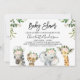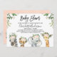 Sweet and elegant girl's safari animals baby shower invitation featuring four jungle animals, some pink floral arrangements and some foliage. This is a sweet way to invite guests to a little girl's safari themed baby shower. Same design is also available for a gender neutral baby shower.