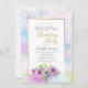 A blue and pink floral surprise birthday party invitation featuring a gold and pastel painted watercolor border.