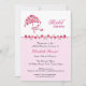 A stylish bridal shower invitation with pink floral umbrella with flowers and ladybug trim. Background has faded pink and white striped pattern. Coordinating pieces available in store.
