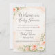 Welcome your guests in style with this beautiful and romantic Baby Shower Welcome Sign. The design features a soft watercolor aesthetic, adorned with delicate pink and white flowers and lush green leaves that create a warm and inviting atmosphere.