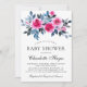 Elegant and feminine baby shower invitation design featuring pink watercolor roses, blue and grey foliage on a white background. Reverse side of the invitation is in bright pink colour.