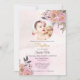 This beautiful baptism or christening invitation features pink flowers, with a soft pink watercolor background, and a gold cross in the centre. The back of the card is a soft pink watercolor background with pink floral.