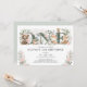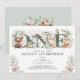 This elegant 1st birthday invitation features soft watercolor pink blush flowers, sage green eucalyptus leaves, adorable forest animals and modern lettering. Perfect for a girl's first birthday!