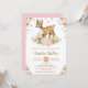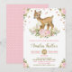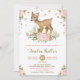 Gorgeous Baby Shower Invitation featuring original watercolor illustration of a baby deer and feminine blush pink flowers and faux gold confetti