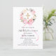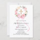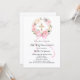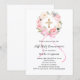 An elegant white background, decorated with watercolored pink and white flowers in a wreath, a pink bow and a golden cross. Personalise and add a name and details.