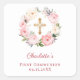 A white background, decorated with watercolored pink and ivory flowers in a wreath and a golden cross. Personalize and add the name and date.