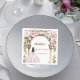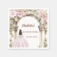 A large marble arch decorated with pink florals. A girl with a light pink dress. Personalize and add a text, name, date.