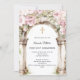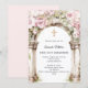 Celebrate your daughter’s sacred milestone with this elegant Pink Florals Arch First Communion Invitation. The front features a clean white background framed by soft pink florals and a marble arch, while the reverse side has a gentle blush pink tone that adds warmth and sophistication.