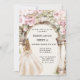 A large marble arch decorated with pink florals. A blonde girl with a white dress.
